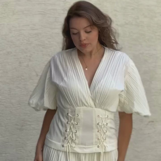 Designed for the fashion-forward woman, the Edda Pleated Dress is a versatile addition to your wardrobe. It features a lace-up waist, puff sleeves, and a flattering V-neckline, making it perfect for both summer holidays and evening events.