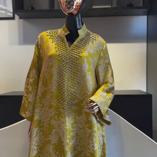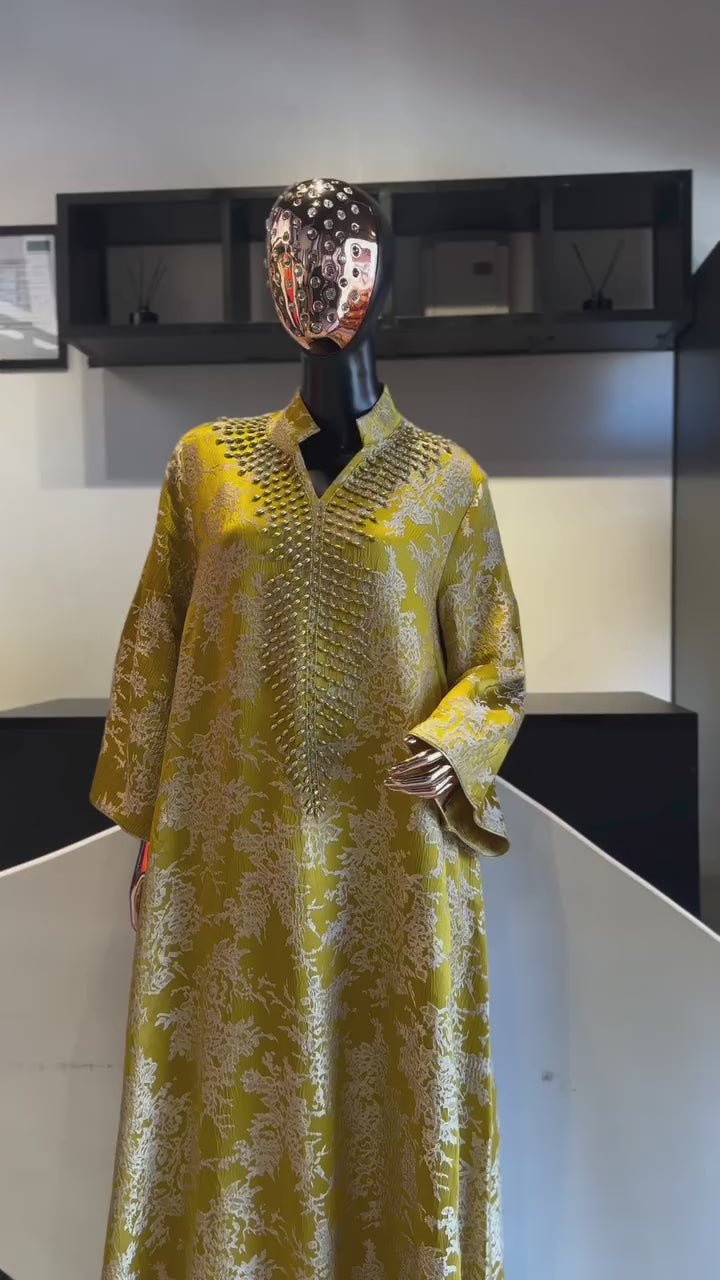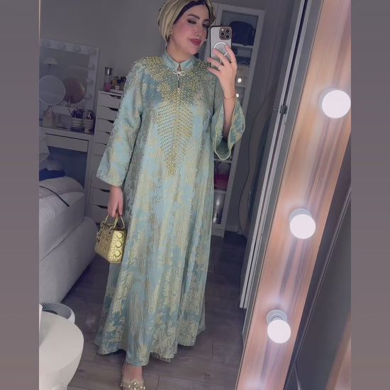 The Hafsa Kaftan blends timeless Arab tradition with refined modern elegance, featuring delicate embroidery and subtle beading. Designed with long sleeves and a stand collar, it offers graceful coverage and a flowing silhouette. Ideal for Ramadan, Eid, and special occasions, this versatile kaftan can be styled as an evening gown or relaxed modest wear. A perfect addition to any modest fashion wardrobe, combining sophistication and effortless style.