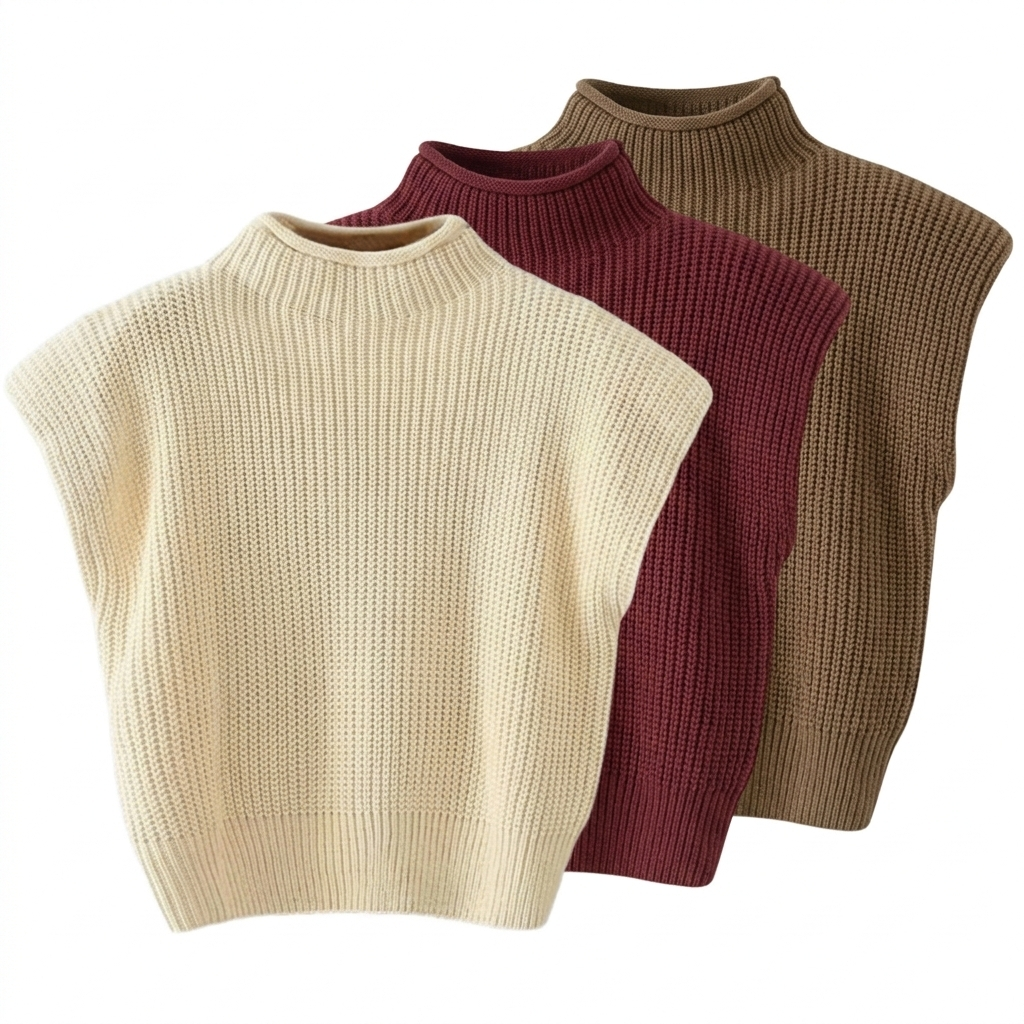 Enhance your casual look with the Kyara padded sweater vest. This stylish high neck sleeveless vest features shoulder pads for added structure and a knitted pullover design. Stay warm and effortlessly chic with this versatile piece.