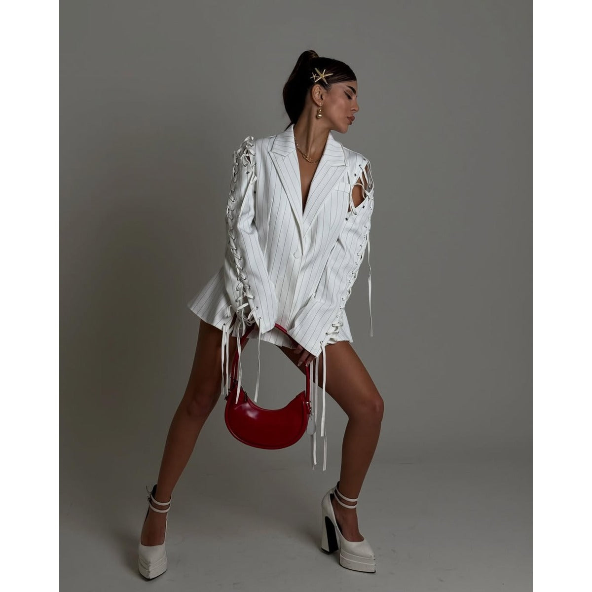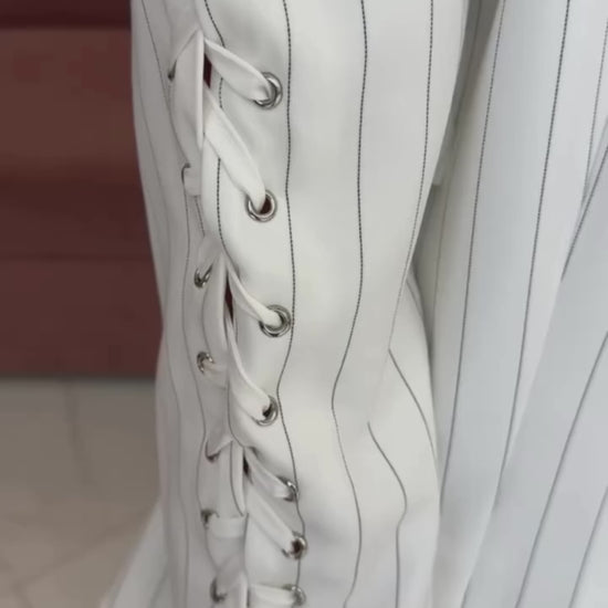 This women's striped blazer is both stylish and functional, featuring a notched collar for a polished look and unique lace-up detailing for added flair. Crafted with attention to detail, this blazer is perfect for any occasion, adding a touch of sophistication to any outfit.