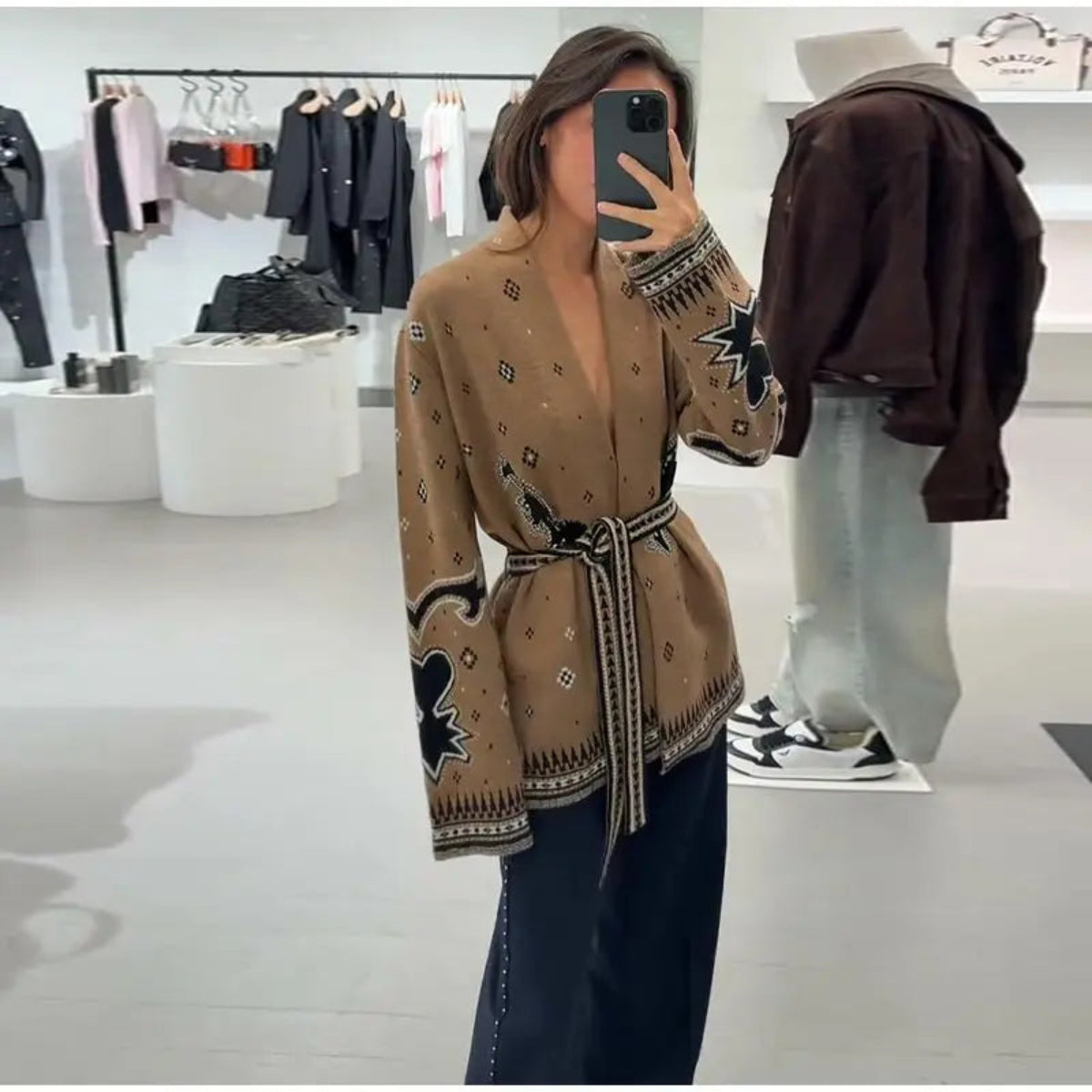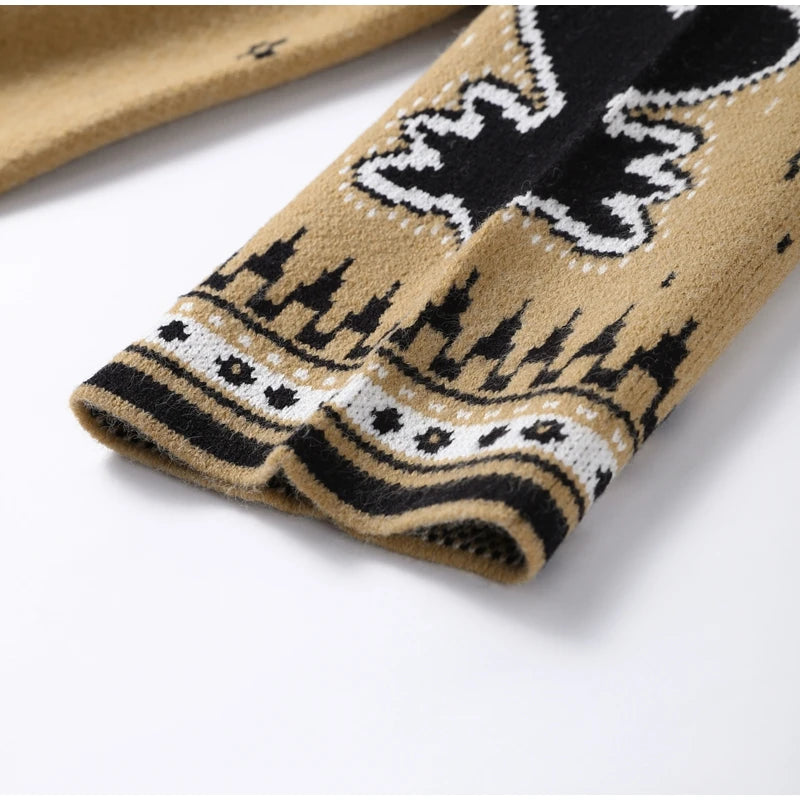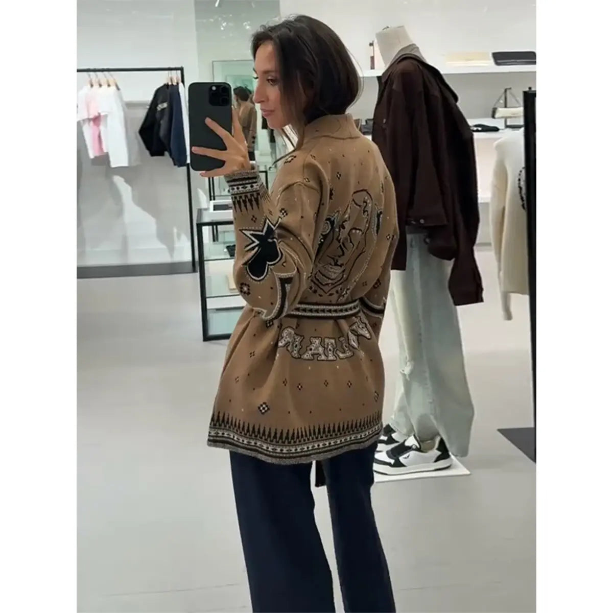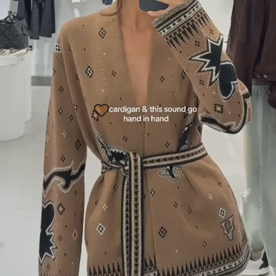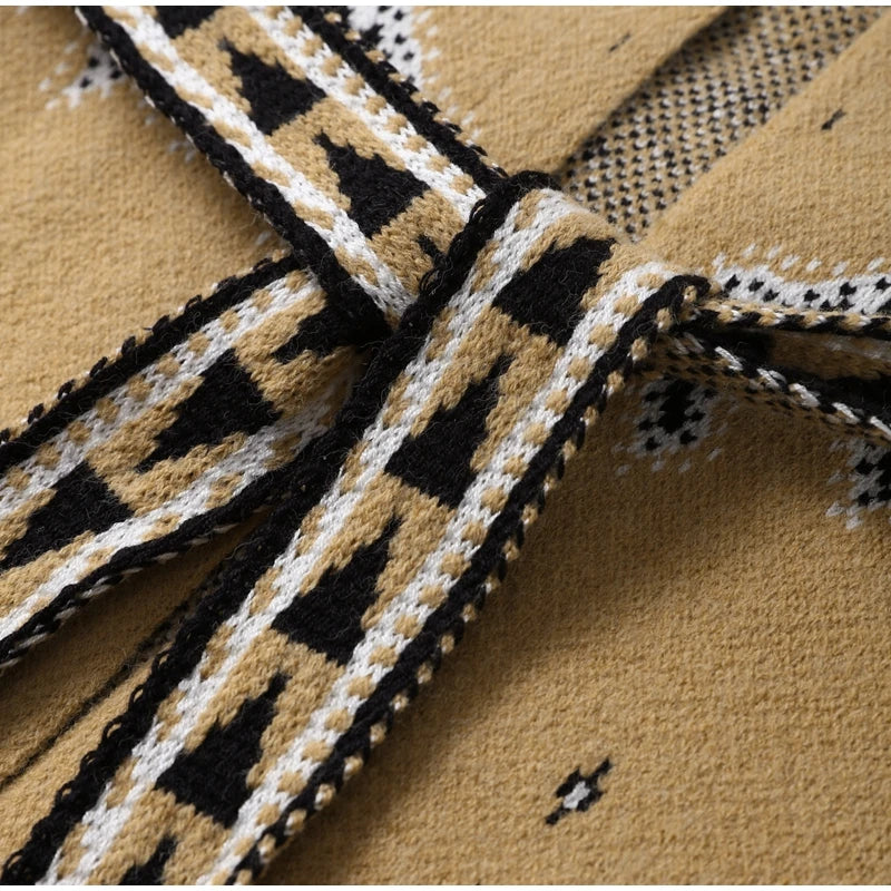 Elevate your wardrobe with this sophisticated knitted cardigan, featuring a striking vintage-inspired patchwork design and iconic skull detailing. The V-neck silhouette and full sleeves offer timeless elegance, while the included lace-up belt allows you to define your silhouette with precision.