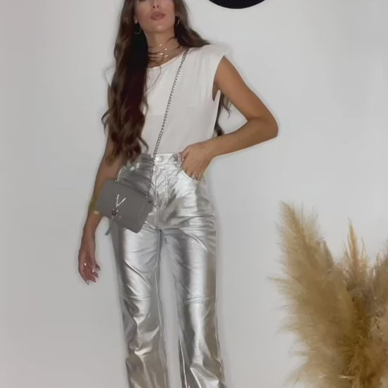 Maya Metallic Trousers feature a high waist and a straight leg design, making them perfect for both streetwear and clubwear. The pants have a shiny metallic finish, adding a touch of fashion-forward style to any outfit.