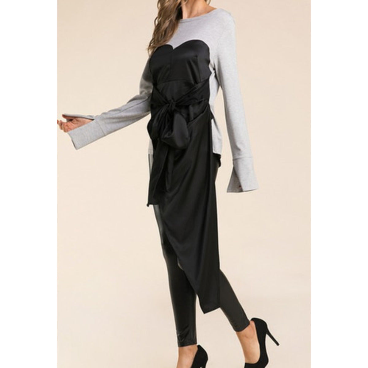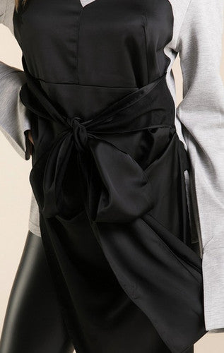 A grey top featuring a black asymmetrical tie-up design with a sweetheart neckline. Upgrade your wardrobe with this stylishly versatile grey top. The black asymmetrical tie-up and sweetheart neckline make for a chic and modern look.